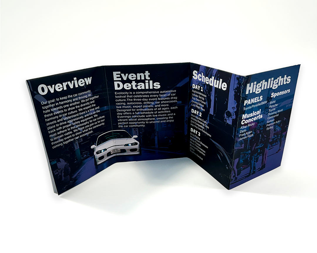 Evolocity’s folding brochure and poster focus on providing information on the event and its goals. At the same time, giving you something to remember and commemorate the event as a celebration, as a poster piece.
